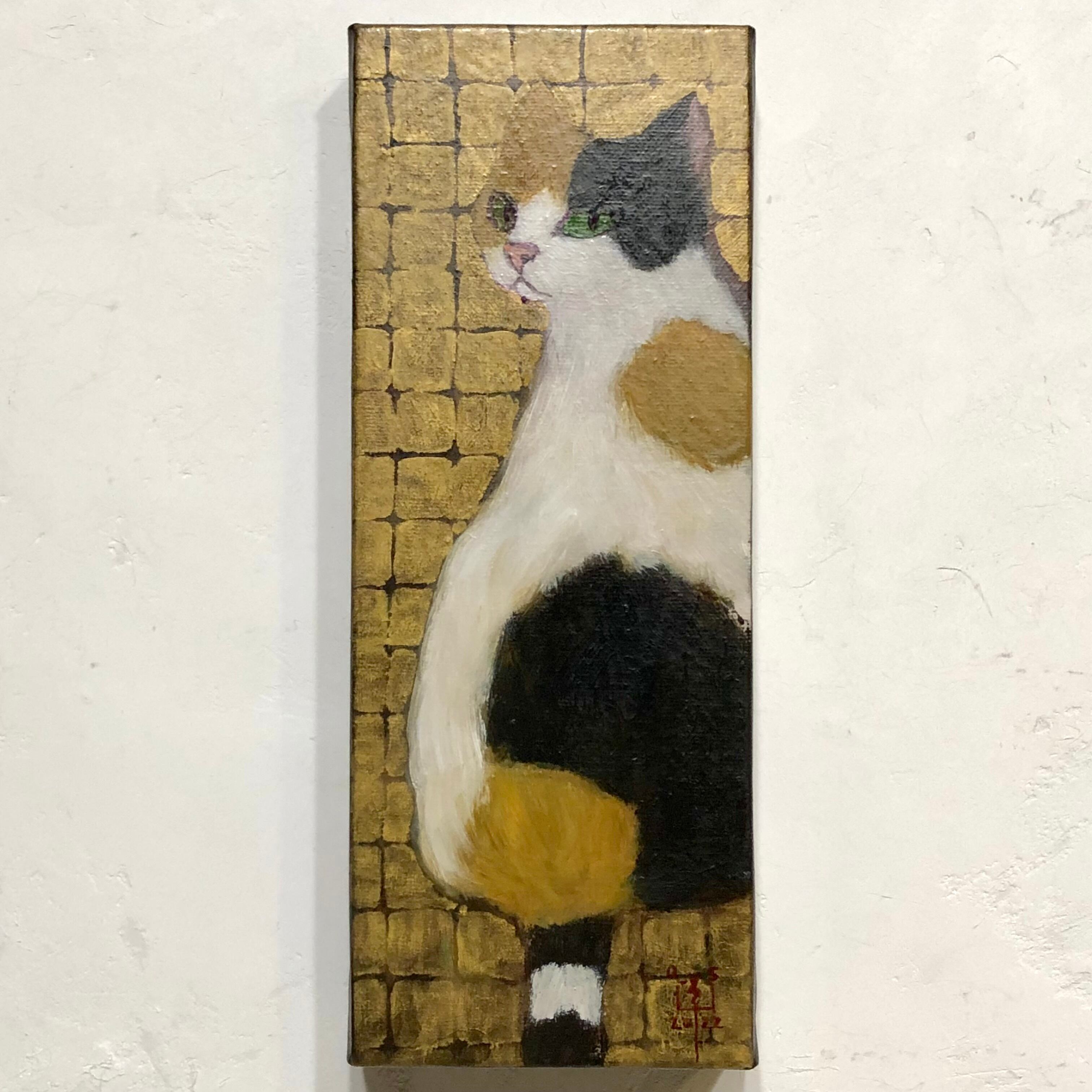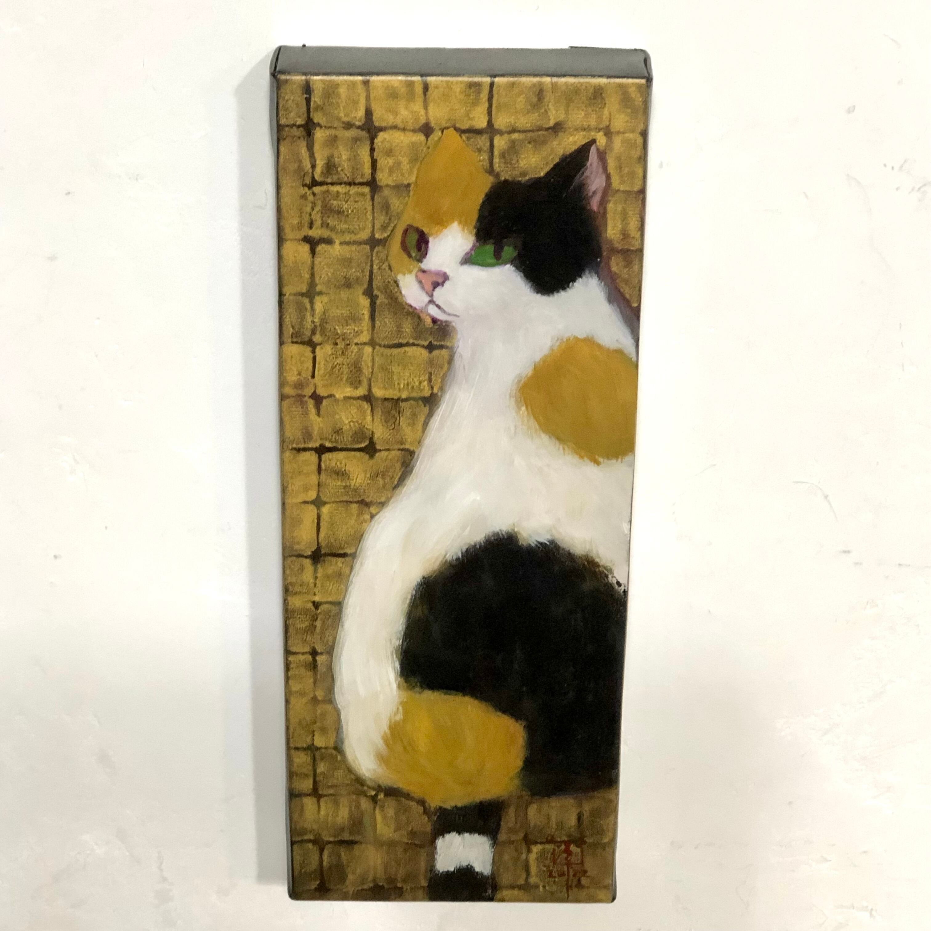 縦長の面白い寸法です。 ちょっとした空間に、ちょっと存在感のある猫絵を飾られるのはいかがでしょうか。