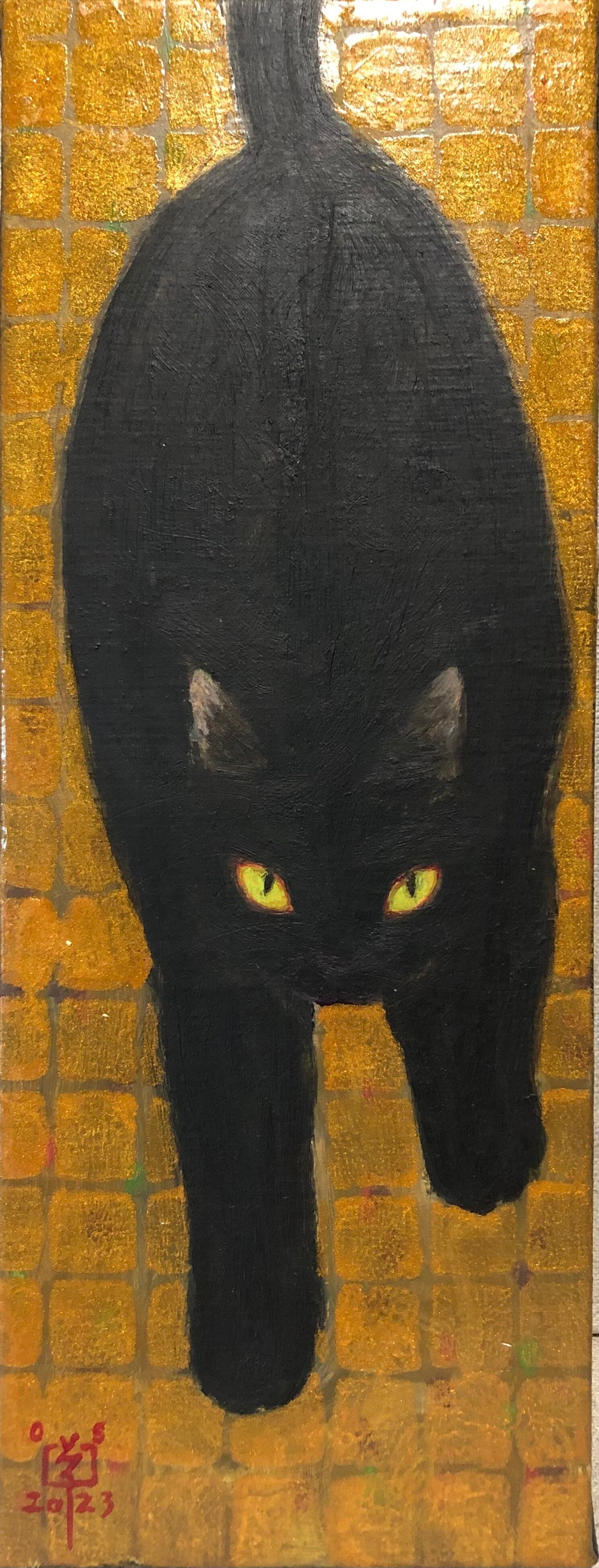 縦長の面白い寸法です。 ちょっとした空間に、ちょっと存在感のある猫絵を飾られるのはいかがでしょうか。