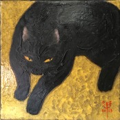 正方形のかわいい寸法です。 ちょっとした空間に、ちょっと存在感のある猫絵を飾られるのはいかがでしょうか。