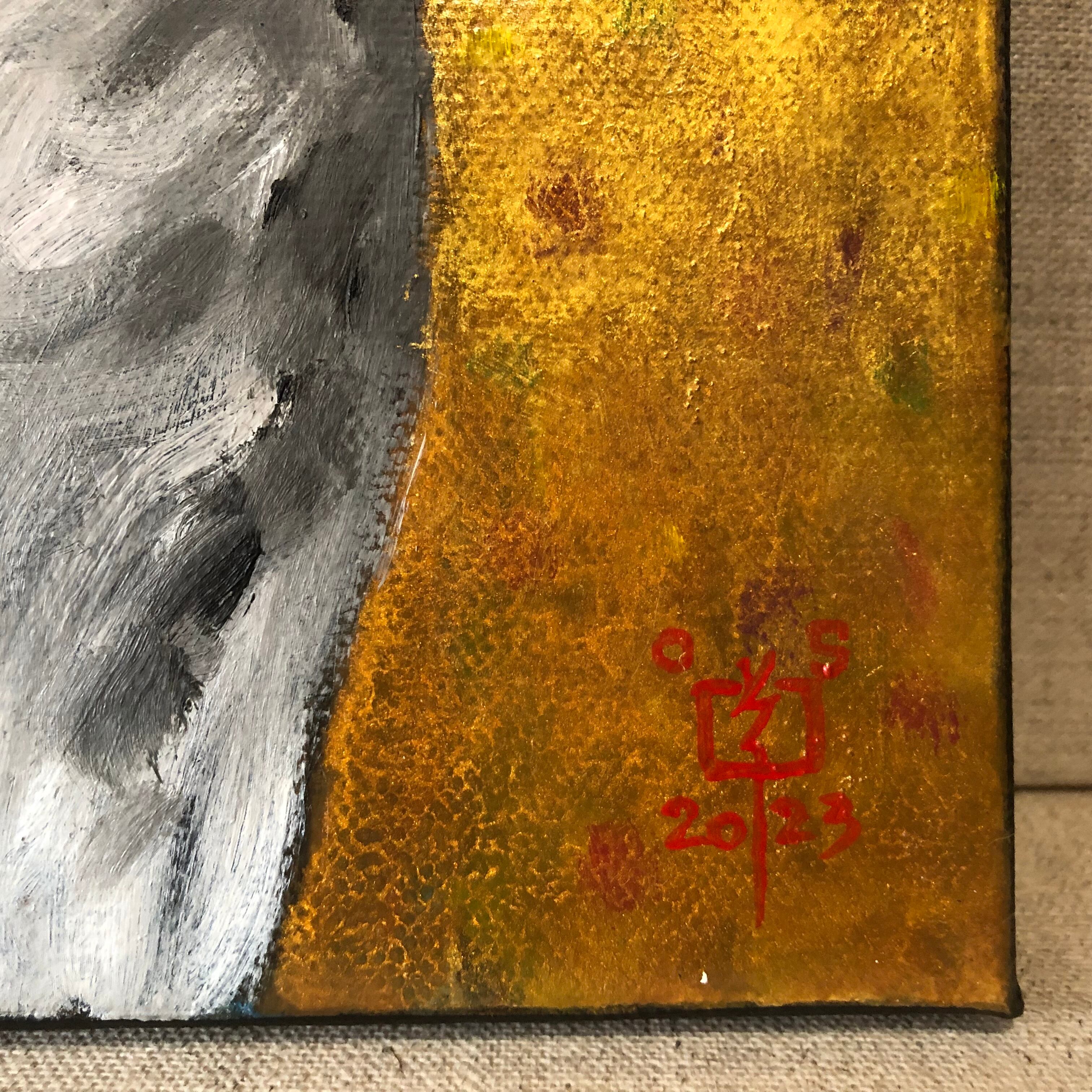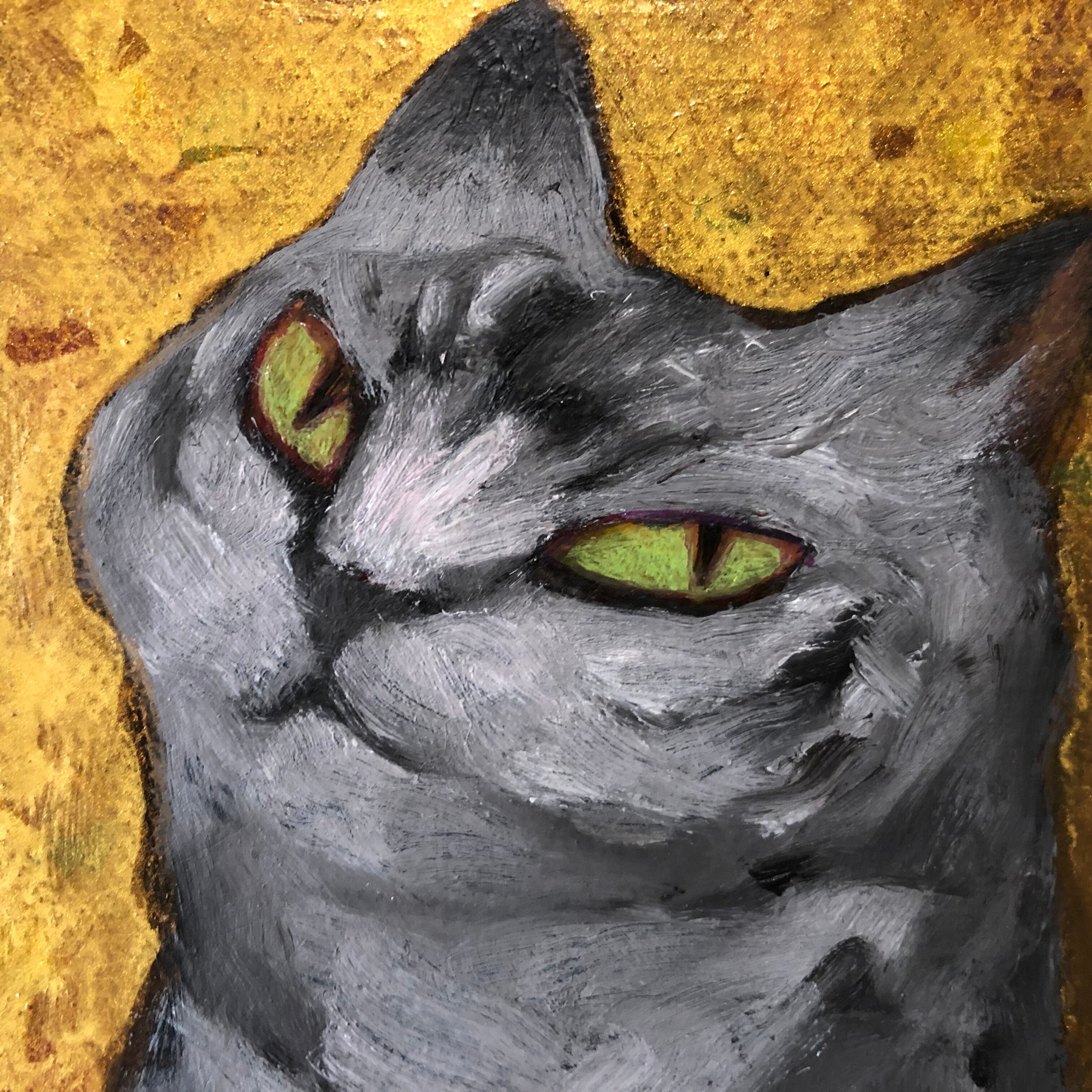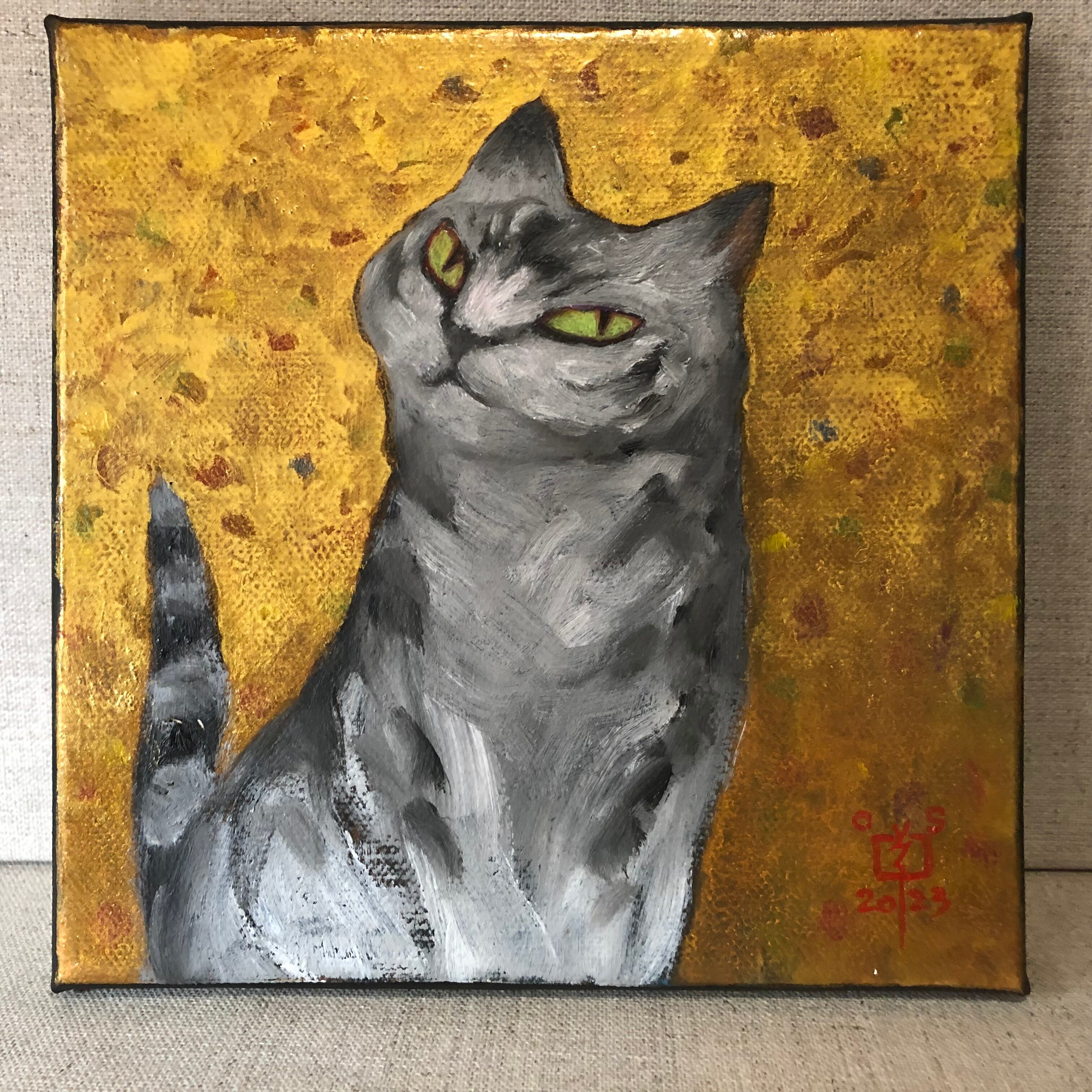 A portrait of a cat painted in oil. The base is wood flame, cotton canvas.