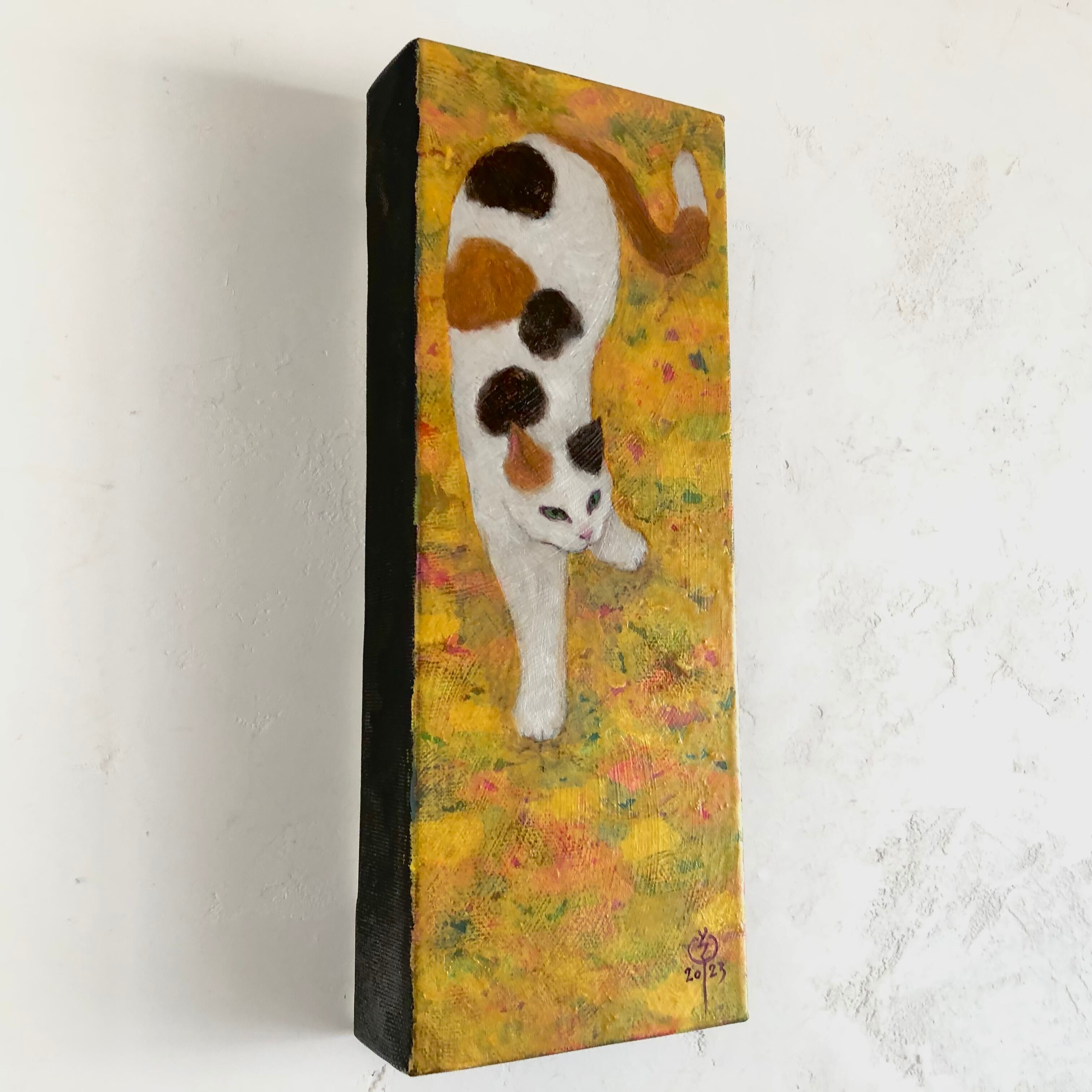 縦長の面白い寸法です。 ちょっとした空間に、ちょっと存在感のある猫絵を飾られるのはいかがでしょうか。