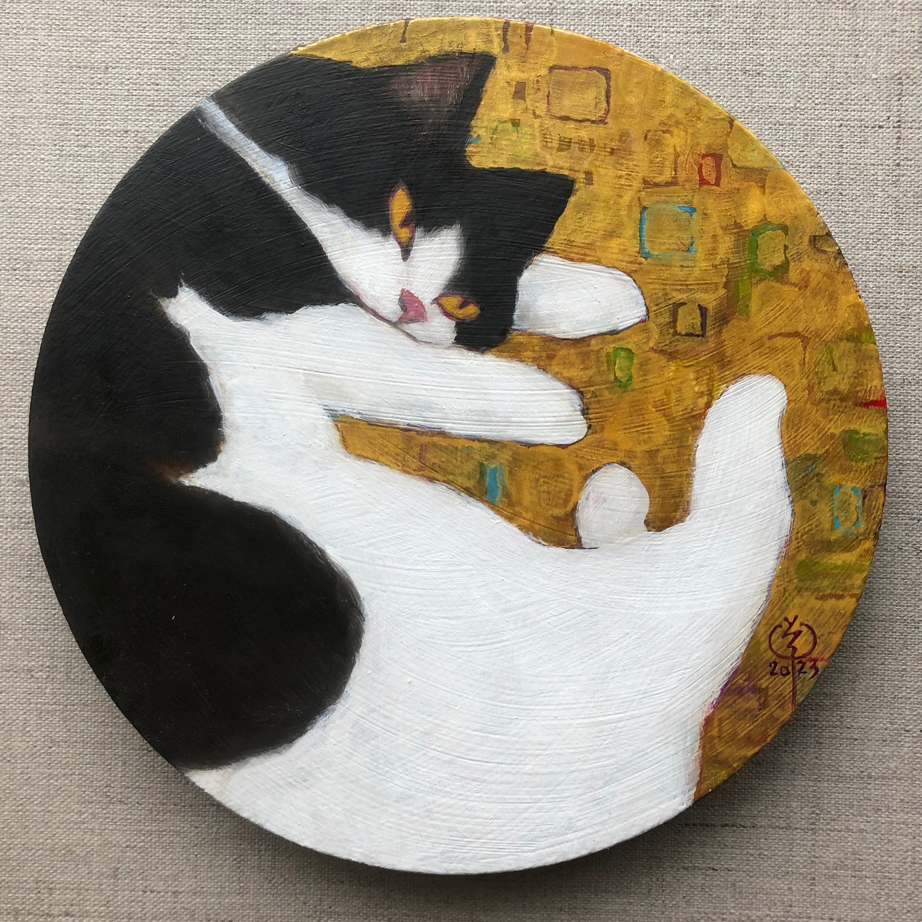 円形の面白い寸法です。 ちょっとした空間に、ちょっと存在感のある猫絵を飾られるのはいかがでしょうか。