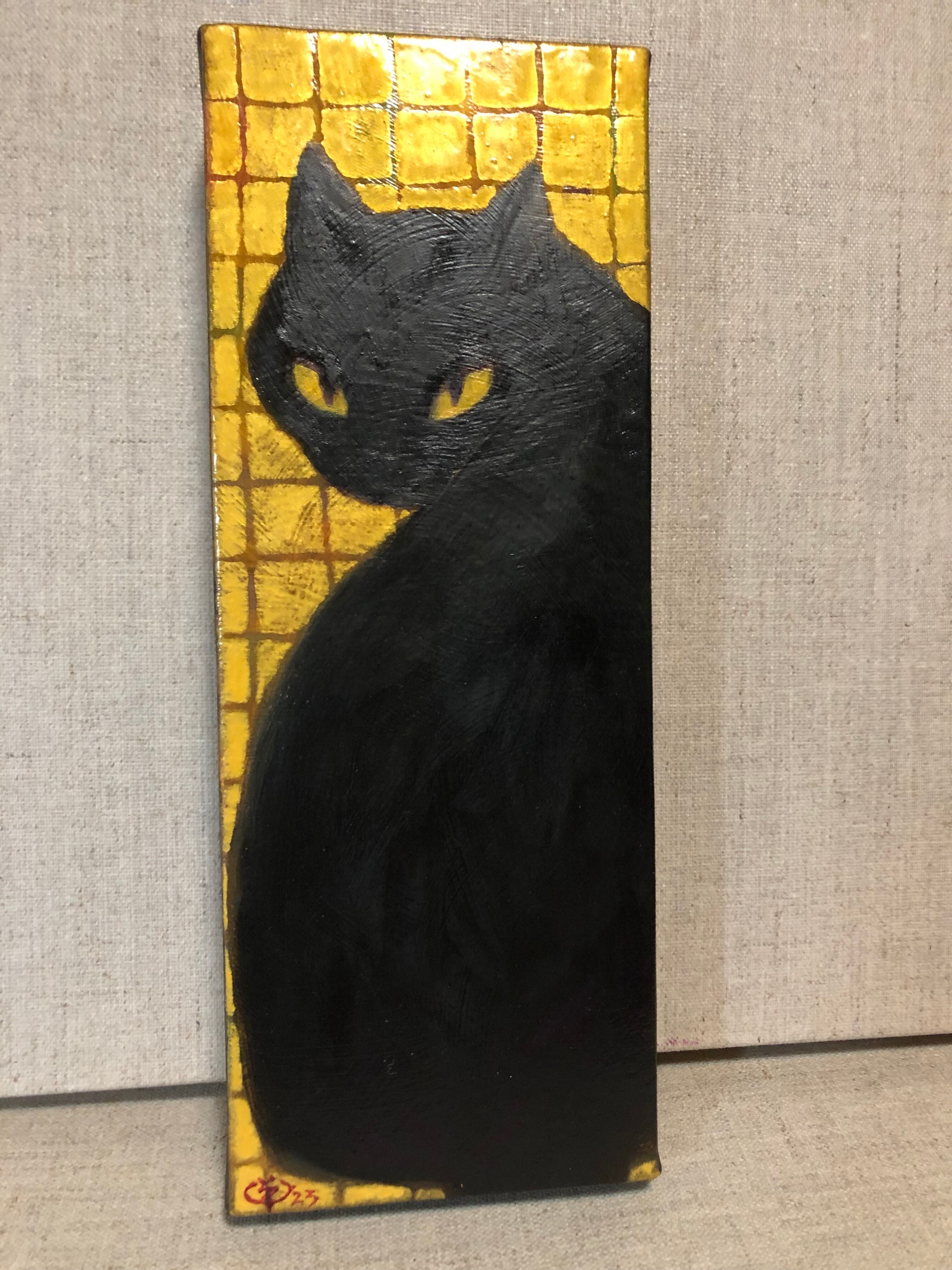 A portrait of a cat painted in oil. The base is wood panel, hemp canvas.
