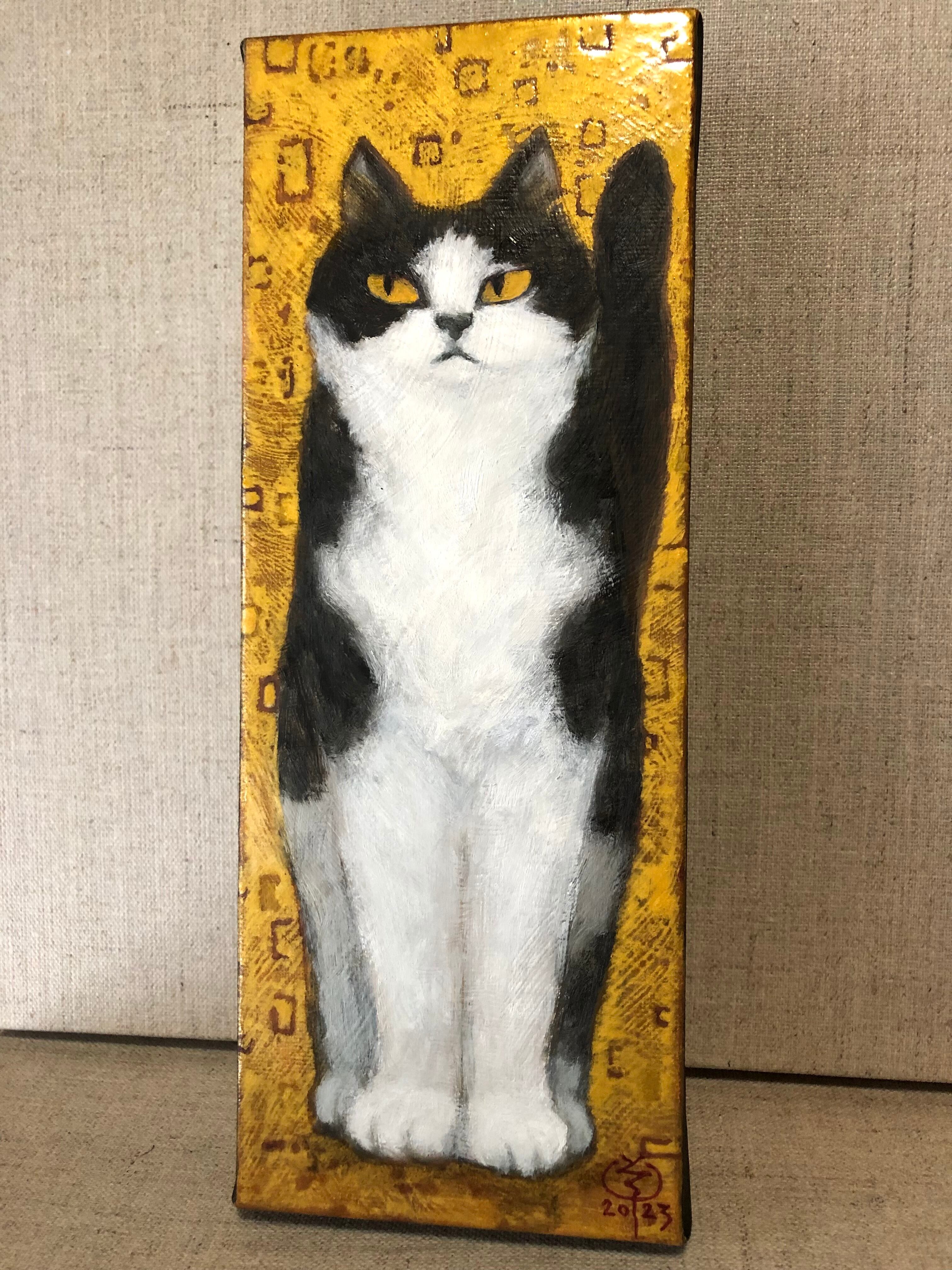縦長の面白い寸法です。 ちょっとした空間に、ちょっと存在感のある猫絵を飾られるのはいかがでしょうか。