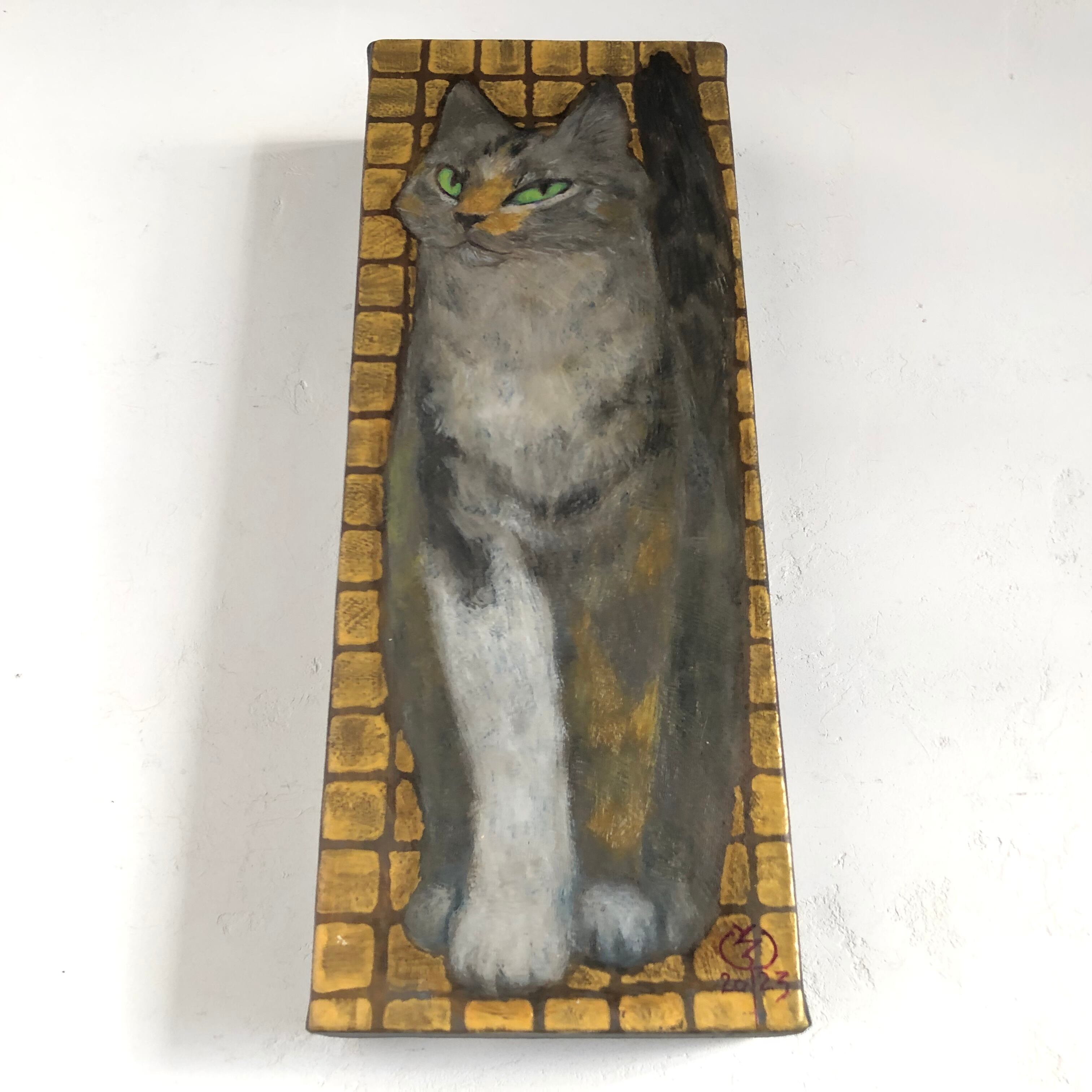 縦長の面白い寸法です。 ちょっとした空間に、ちょっと存在感のある猫絵を飾られるのはいかがでしょうか。