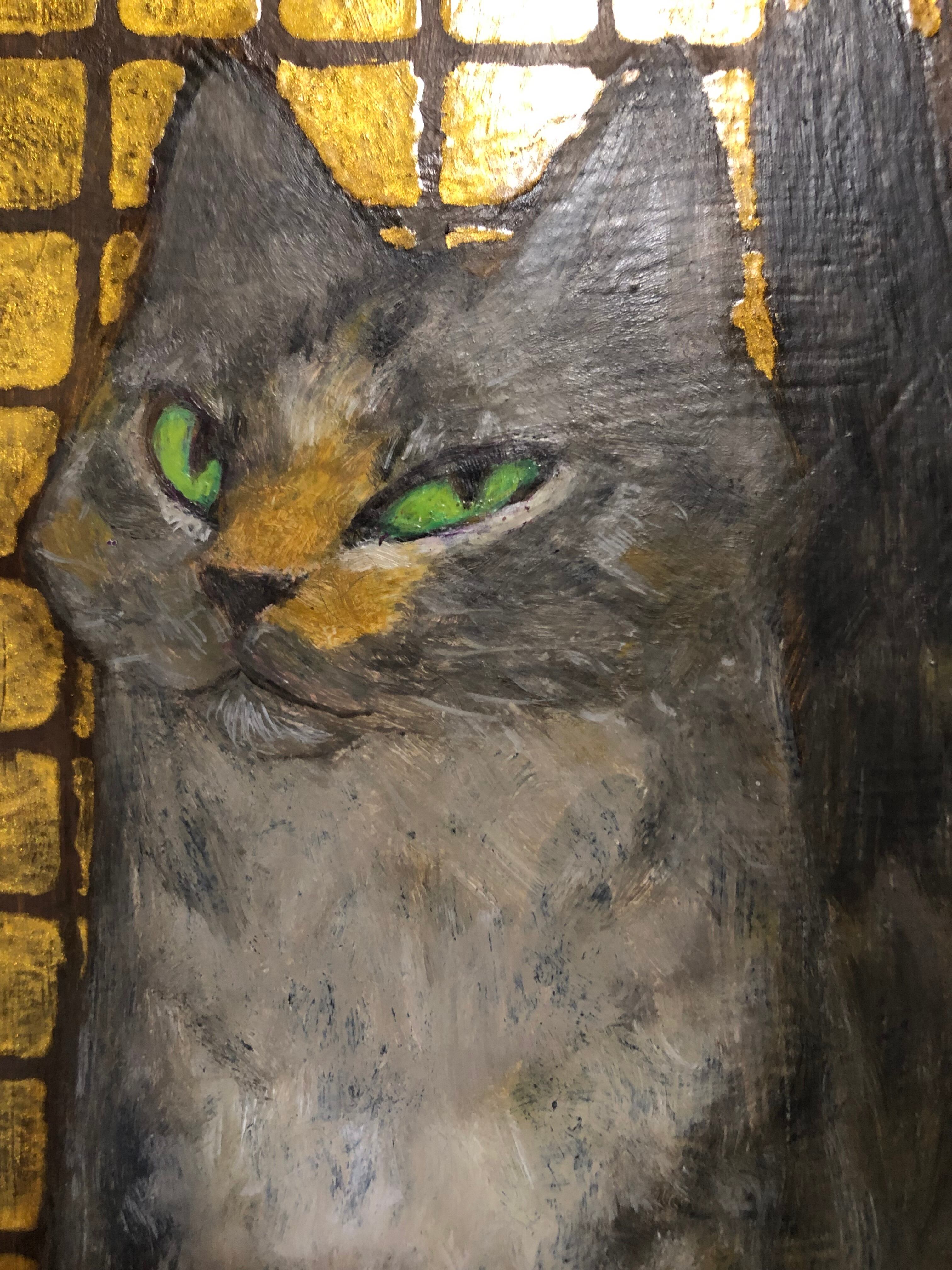 A portrait of a cat painted in oil. The base is wood panel, hemp canvas.