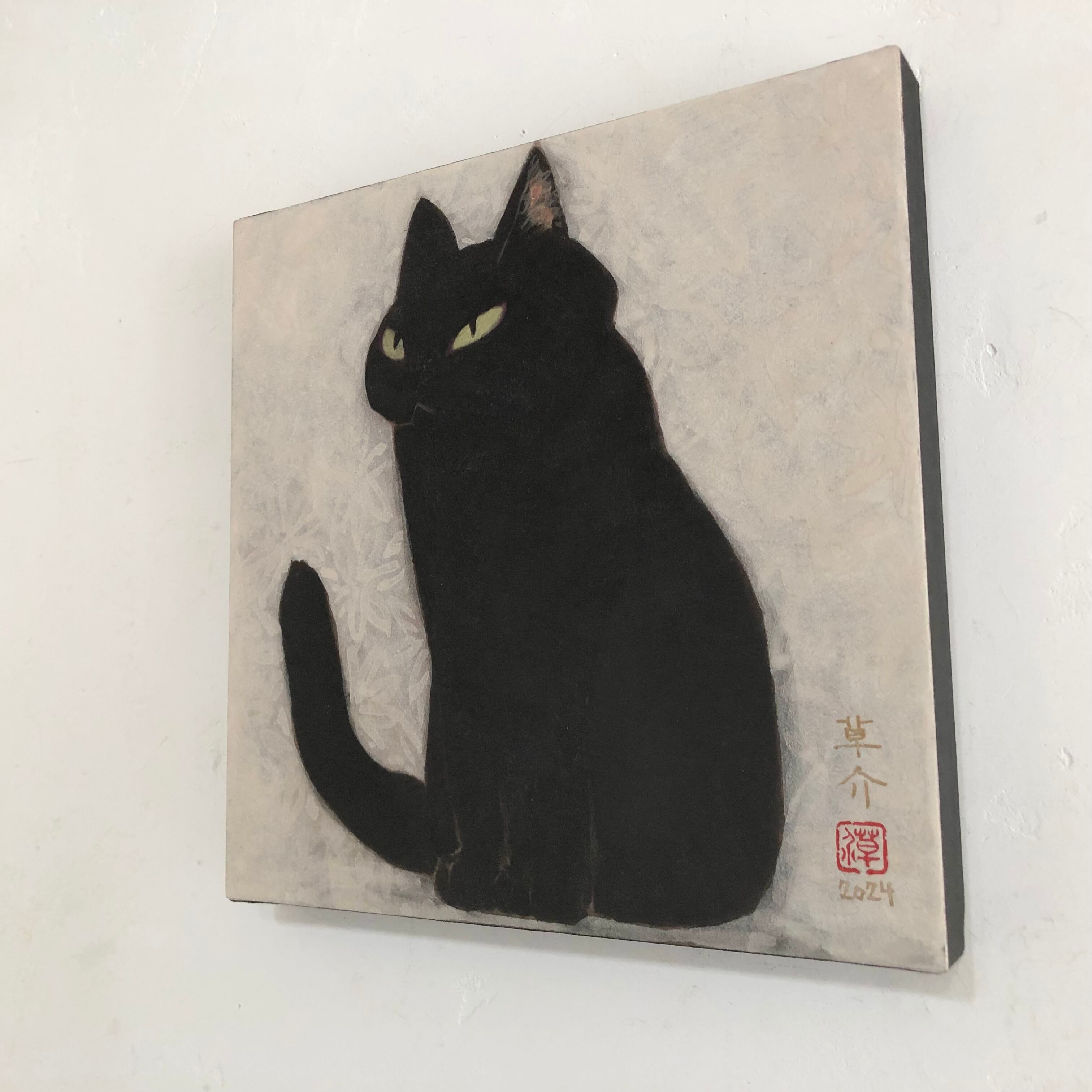 A cat painted with pigment and alkyd medium. The base is wood panel and washi paper.