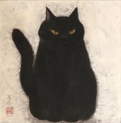 A cat painted with pigment and alkyd medium. The base is wood panel and washi paper.