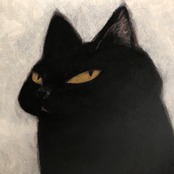 A cat painted with pigment and alkyd medium. The base is wood panel and washi paper.